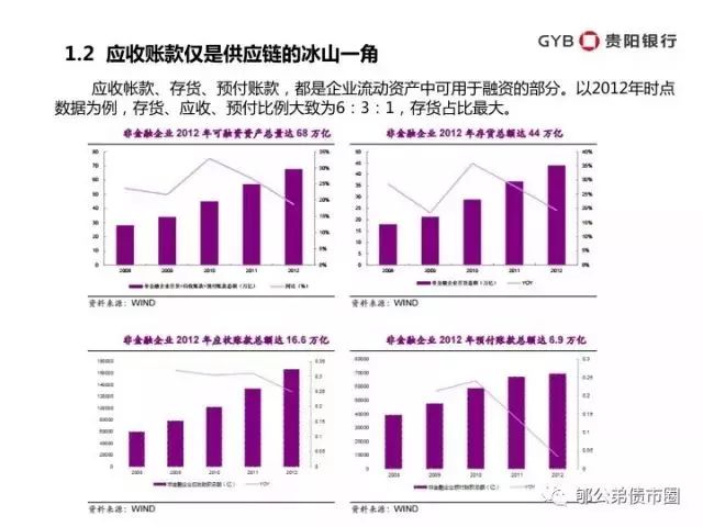 应收帐款、存货、预付账款,都是企业流动资产中可用于融资的部分。以2012年时点数据为例,存货、应收、预付比例大致为6:3:1,存货占比最大。