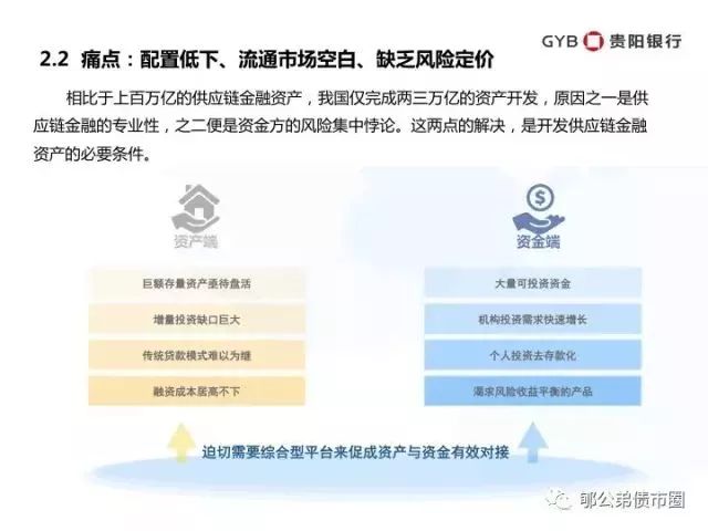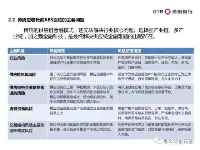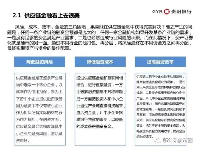 风险、成本、效率,金融的三角困境,果真能在供应链金融中获得完美解决?随之产生的问题是,任何一条产业链的融资金额都是庞大的,任何一家金融机构如果开发某条产业链的需求,一是没有足够的资金满足产业需求,二是也必然造成行业风险的积聚。而在此情况下,资产证券化就是硬币的另一面。通过不同行业的池打包、再分层,将风险最终在不同资金方之间再分配,最终实现资产与资金的最佳配置。