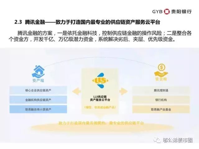 腾讯金融的方案,一是依托金融科技,控制供应链金融的操作风险;二是整合各个资金方,开发千亿、万亿级潜力资金,系统解决劣后、夹层、优先级资金。