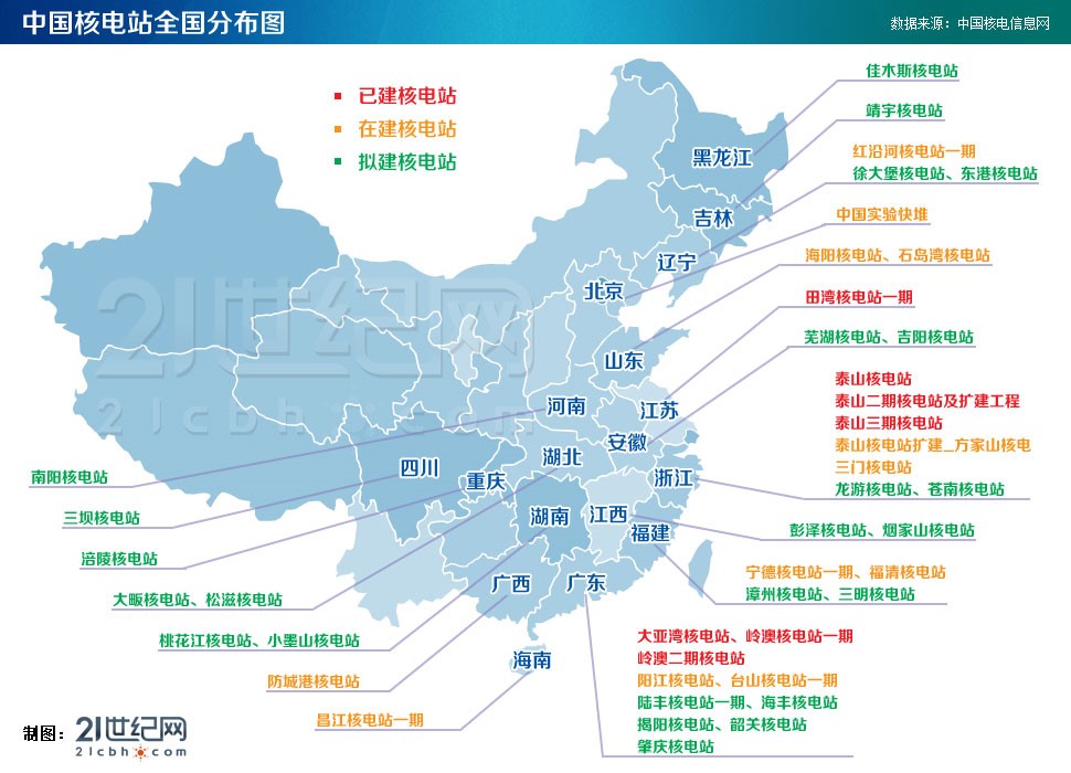 中国已有和在建的核电站分布图.docx
