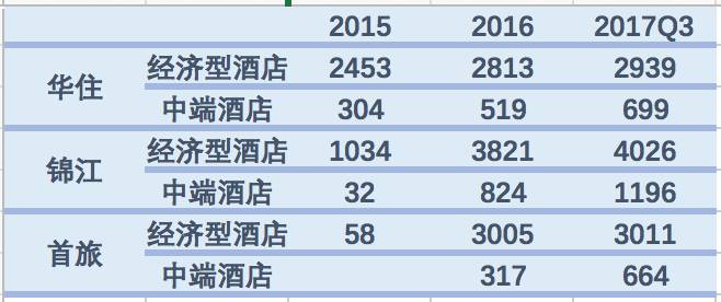 从目前三巨头的布局来看,截止2017年三季度末,锦江的酒店数最多,中高端酒店占比也最高。华住酒店数虽和首旅如家相差不多,但华住的中高端酒店占比显著高于首旅如家。
