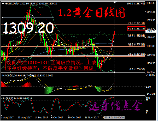 【1.2晚间欧美盘操作建议】1,早间1305及之前的多单部分仓位1310获利出局;持有仓位上调止损位,先看1311,争取更大利润;