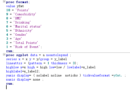 求助大家,为什么我用sas做nomograms图中间的变量名称和线条都不显示,谢谢大家,附上图和程序,希望大家帮助