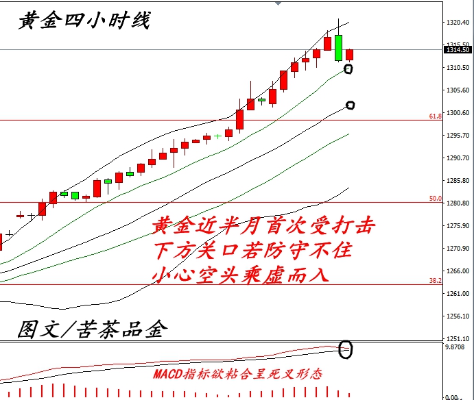 随着今天的一波跌势,金价终于回顾四小时线布林带通道中上轨之间,而附图MACD似乎也在这一次下跌中有快慢线粘合形成死叉走势,红色动能柱也开始减缓,一旦下方再次跌破MA10均线,今日欧美盘还将延续高达日内15美元左右的跌势,初步估计技术性回调至1308一线,那么会在布林带中轨1302一线形成支撑。另外临近“大小非农”之际,莫不要盲目追多,防止在非农爆出的意外天鹅带来损失。