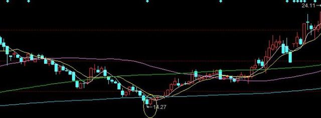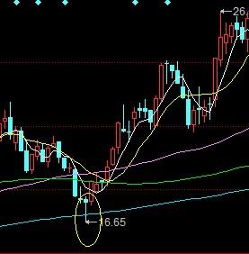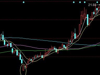 2、长期下跌后,一针刺到底(如下图圈内),财宝顶到天(金针底)