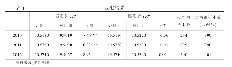 其中,TFP1和 TFP0分别表示处理组企业i和与之匹配的对照组企业 j的生产率;C(i)表示与处理组企业i 匹配的对照组企业集合;γ表示对照组企业j与处理组企业i的匹配中所占权重;N为匹配成功的企业总对数。依旧不知道怎么得出下表。