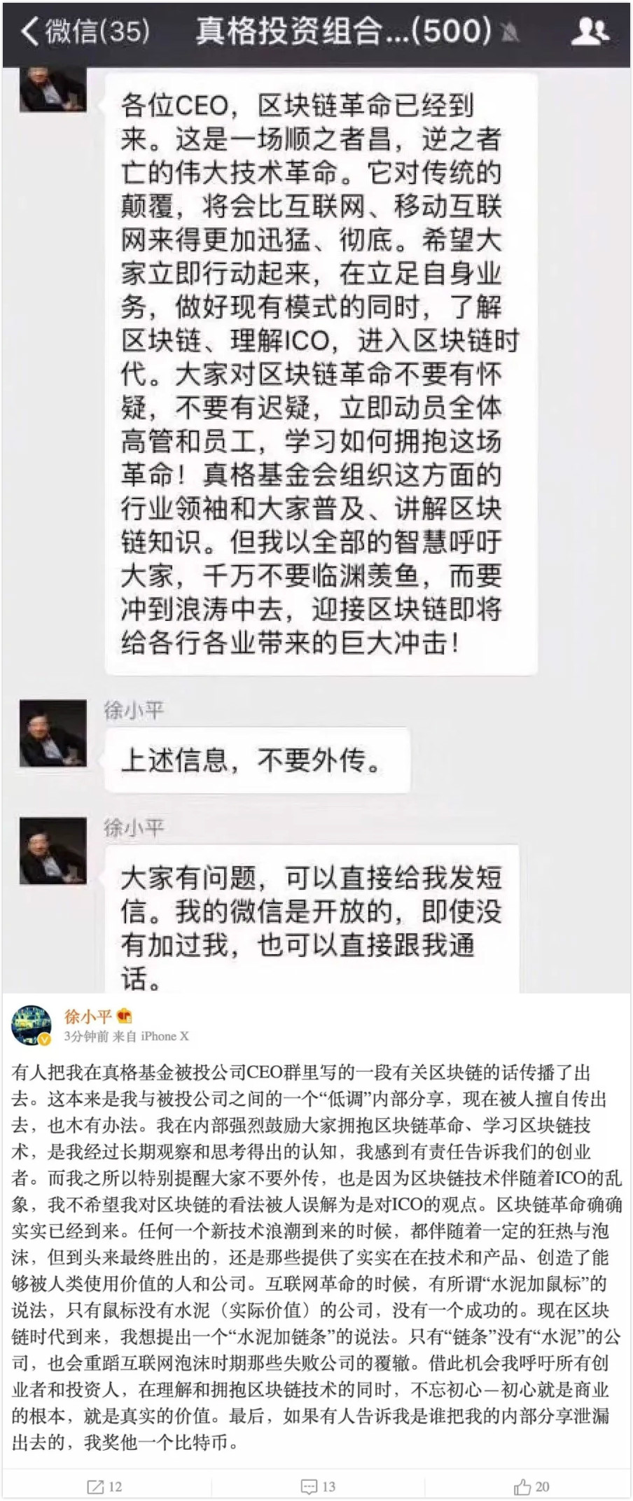 1月9日,徐小平在自己的微信内部群中分享了一段区块链的内容,他十分看好区块链技术,不过他在群中嘱咐不要外传。但最终这段内部分享的内容截图被泄露出去,还被大量热传。随后徐小平对内部分享泄露进行了回应,他称,告诉是谁做的,奖他一个比特币。