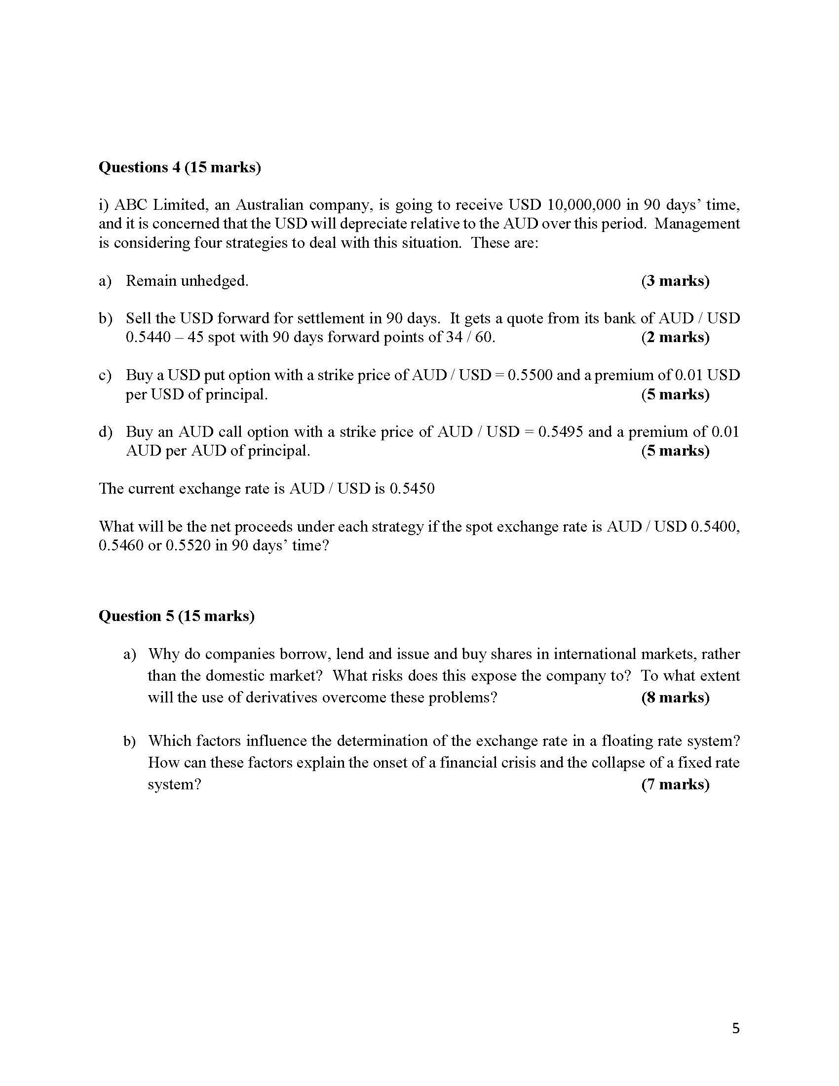 i) ABC Limited,an Australian company,is going to receive USD 10,000,000 in 90 days’ time,and it is concerned that the USD will depreciate relative to the AUD over this period.Management is considering four strategies to deal with this situation. These are: