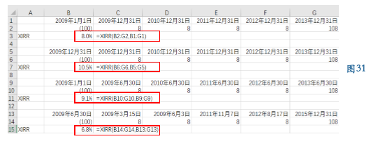 图31:四个例⼦演示了XIRR函数是如何基于不同 的时间线进⾏计算的。C3、C7、C11和C15中分别 显示了B3、B7、B11和B15中单元格中的公式。这 里的公式忽略了估计比率。