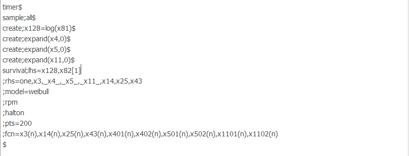 模型涉及变量: x3 性别,0-1变量; x4 年龄,三分类变量,取值范围1-3; x5 交通方式,三分类变量,取值范围1-3; x11 分类变量,取值范围1-3; x14 数值变量; x25 数值变量; x43 数值变量; x128 等待时间,以秒计,数值变量; x82 二分类变量,1表示删失变量,2表示完全变量。