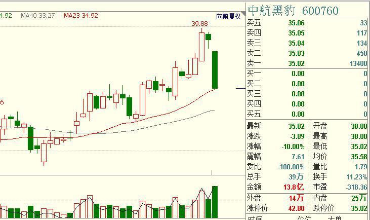 齐鲁财 富网从鲁股市场了解到,1月12日,原山东上市公司“中航黑豹”正式更名为“中航沈飞”,股票代码依然为600760。有趣的是,或是利好出尽遭到资金打压缘故,今日早间开盘后股价便一路下滑随后横盘,最终下午收盘封于跌停板,成为更名后当日跌停个股。
