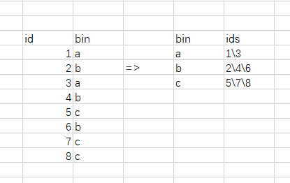 01.SELECT bin,concat (GROUP_CONCAT(id),"\") AS ids FROM tb_name GROUP BY bin
