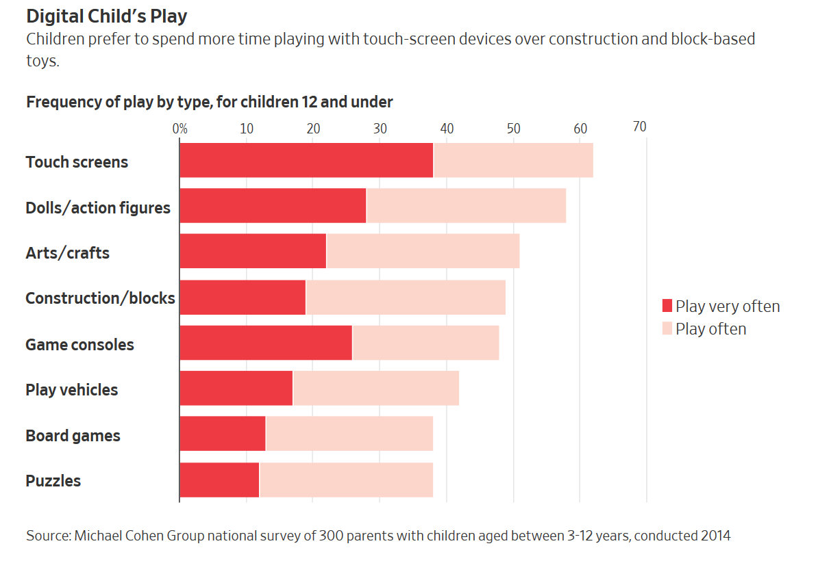 Digital Child's PlayChildren prefer to spend more time playing with touch-screen devices over construction and block-basedtoys.Frequency of play by type, for children 12 and underSource: Michael Cohen Group national survey of 300 parents with children aged between 3-12 years, conducted 2014