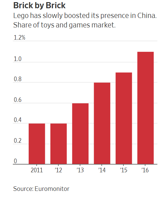 While privately held Lego doesn’t break out sales for individual countries, the company has recorded double-digit sales growth in China for a number of years, according to a spokesman. He said Lego grew between 30% and 35% in China in 2016, the latest full-year results available.