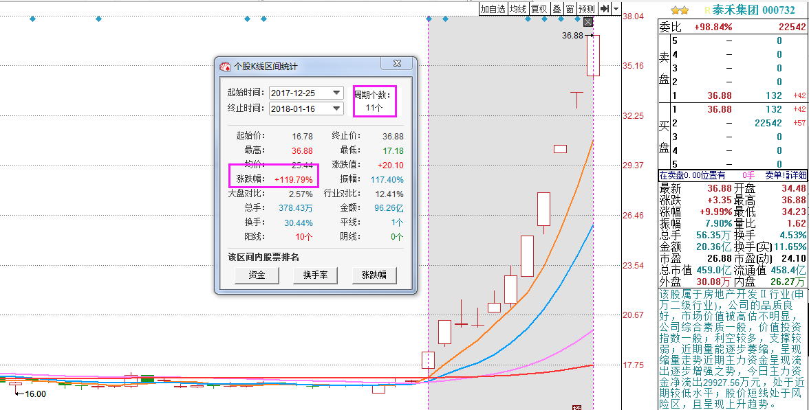 这一举措更是刺激地产股的全线走强,版块内多只个股涨停。先行启动的地产股【泰禾集团 000732】11个交易更是录得119.79%的翻倍涨幅。
