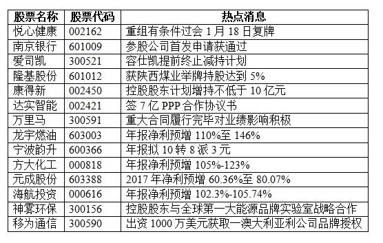 1月17日沪指小幅高开,开盘在证券等金融股影响下再创反弹新高,午后维持窄幅震荡走势,收盘小幅飘红。创业板指数振幅较大,早盘低开后即直线走低盘中一度跌近2%,午盘在芯片概念股刺激下直线拉升,全天创业板指数振幅高达3.03%。股市行情延续分化走势,证券、保险等金融股强势拉升,前期大涨的区块链概念集体回落。盘面上,区块链多家个股停牌,板块多只个股跌停,地产股集体回落,证券股盘中大涨,银行,保险概念相继反弹,带动沪指冲击前高。全天两市涨停个股超40只,跌停个股也有20只。具体来看,两市有1715只个股上涨,有1408只个股下跌。主板全天证券、保险及其他、银行等板块表现较好涨幅居前;饮料制造、房地产开发、造纸等板块表现偏弱跌幅居前。截至收盘,上证综指上涨0.24%,收于3444.67点;深证成指下跌0.73%,收于11303.97点;创业板指数上涨0.72%,收于1742.03点。