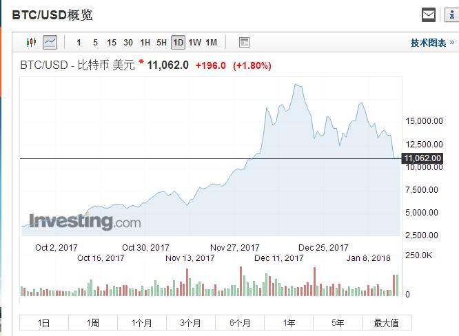 数字货币综合报价平台INVESTING显示,比特币价格目前为10911美元,微张0.78%。齐鲁财富网从比特币美元价格走势图发现,从去年9月份开始,比特币开启了暴涨行情,进入到12月时价格已经上涨到1万美元,随后一度达到19187美元,逼近2万元关口,随后价格震荡下降,1月17日时一度跌破1万美元关口,最低达到9250美元,今日勉强上涨到1万美元以上。