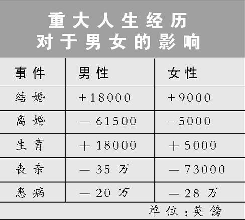 澳大利亚昆士兰科技大学教授保罗·弗里吉特斯称,婚姻、生子、丧亲等重大人生经历对于人类幸福和痛苦感的影响可以用金钱来衡量,而在这些重大经历上,男女之间的感受差别都很大。