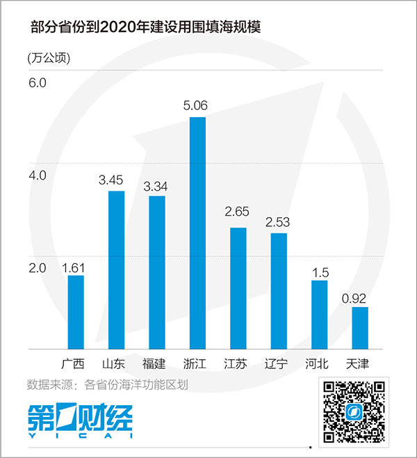 早在2012年,国务院密集出台地方海洋区划,明确提出沿海各地建设用围填海规模控制指标,严控围填海规模。如《广西壮族自治区海洋功能区划》明确到2020年,全区建设用围填海规模控制在1.61万公顷以内。再如,山东、福建、浙江、江苏、辽宁、河北、天津的海洋功能区划分别规定建设用围填海规模控制在3.45万公顷、3.335万公顷、5.06万公顷、2.645万公顷、2.53万公顷、1.495万公顷和0.92万公顷以内。