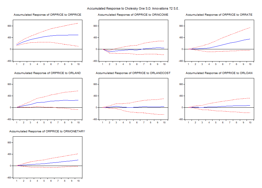 做毕业论文,研究房地产价格影响因素, 季度数据,ADF检验一阶平稳,AR根图平稳,我用原始数据(OR开头)和对数处理(LN开头)后的数据都做了var模型,脉冲响应分析大同小异,现在问题最大的是结果和理论不符啊。人均收入竟然对房地产价格有反向作用;而土地供应量竟然对房地产价格有正向作用,土地均价和信贷扩张竟然没作用;弄了几天数据还是做不出期望的与理论相符的结果,这是怎么一回事啊,求解释?