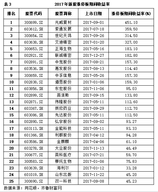 2017年山东新股涨停板期间平均收益率由2016年的258.03%降至144.83%