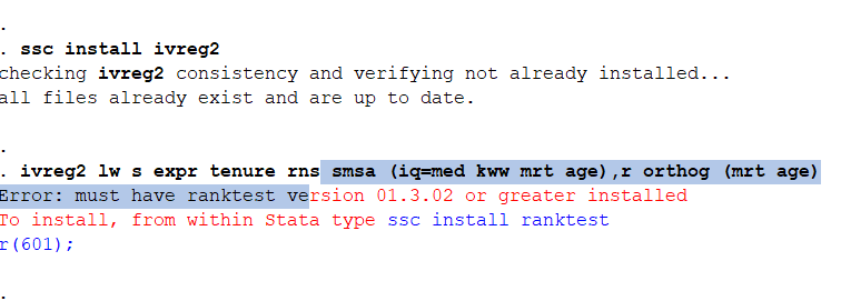 黃河泉 发表于 2018-1-29 16:57 用 ivreg2 需要另外再加挂 ssc install ranktest,或按一下上面蓝色 (不是蓝色版主哦!哈哈!) 之部分安装 ...