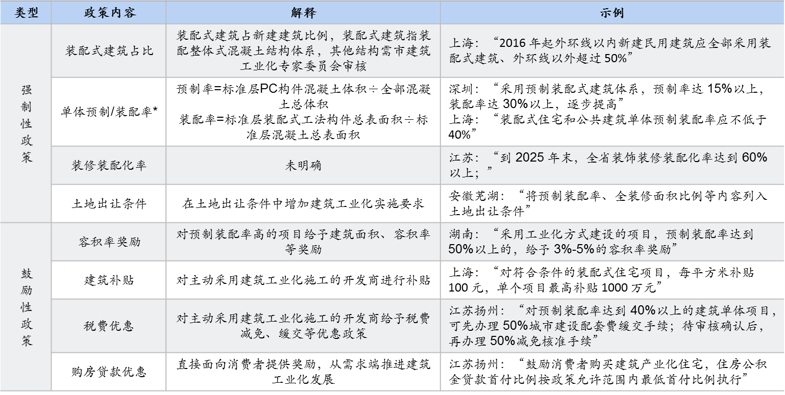 建筑业态方面,各地政策强调保障房建设中建筑工业化的应用,北京、上海、合肥等地均对装配式建筑占比、单体预制装配率等提出明确要求。