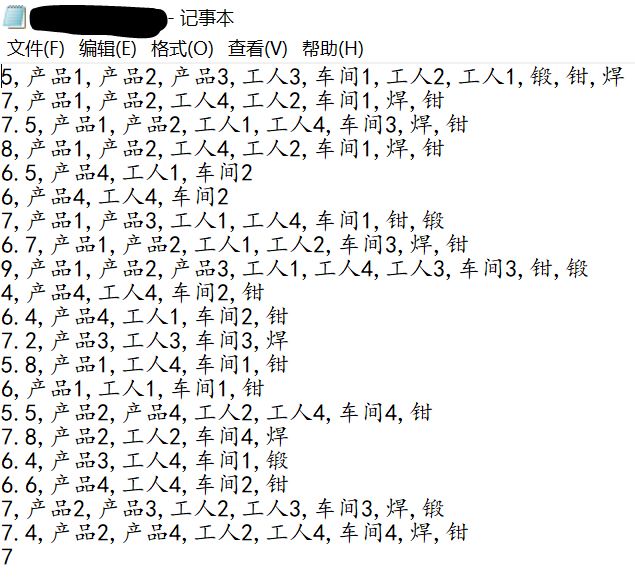 txt中数据如下: 5,产品1,产品2,产品3,工人3,车间1,工人2,工人1,锻,钳,焊