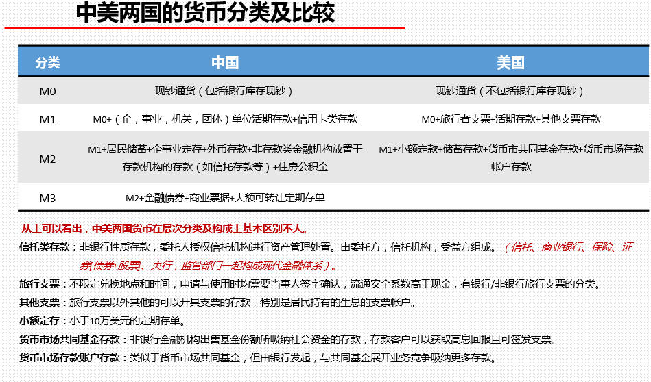 货币的层次发类,众所周知可以分为M0,M1,M2。另外还有M3,M4(如英国)等分法。但国际主流方对于M0到M2的概念基本一致,都从是从流动性强弱的方面考虑的。M2总体来讲由:《现钞+活期+定存》这三个方面组成。