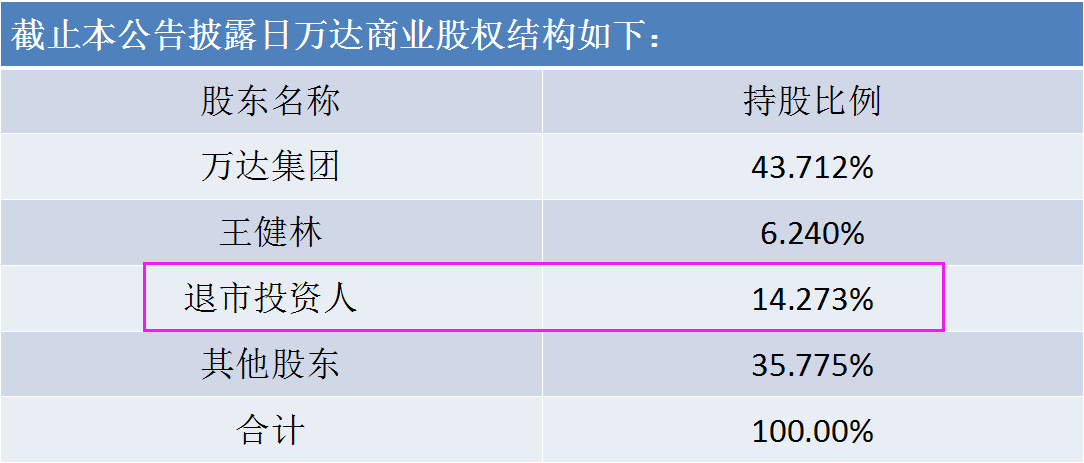 也就是说前期私有化引入的投资者即将退出,让位于腾讯、苏宁、京东、融创。之前私有化引入投资者的持股比例为14.273%,而新加入的四家公司持股计划持股比例为14%,剩余的0.273%去向还不清楚,但有一点可以确定的是,若万达商业在A股成功上市,最大的受益者非腾讯、苏宁、京东、融创莫属。