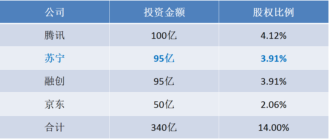 根据四家公司的持股比例来看,主发起方腾讯占股比例最高为4.12%;其次是苏宁、融创各3.91%;京东持股2.06%。