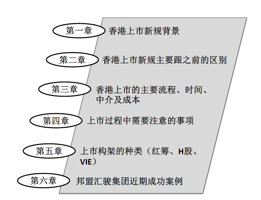 香港上市新规下的解读与攻略:香港上市新规背景,香港上市新规主要跟之前的区别,香港上市的主要流程、时间、中介及成本,上市过程中需要注意的事项,上市构架的种类(红筹、H股、VIE),邦盟汇骏集团近期案例。