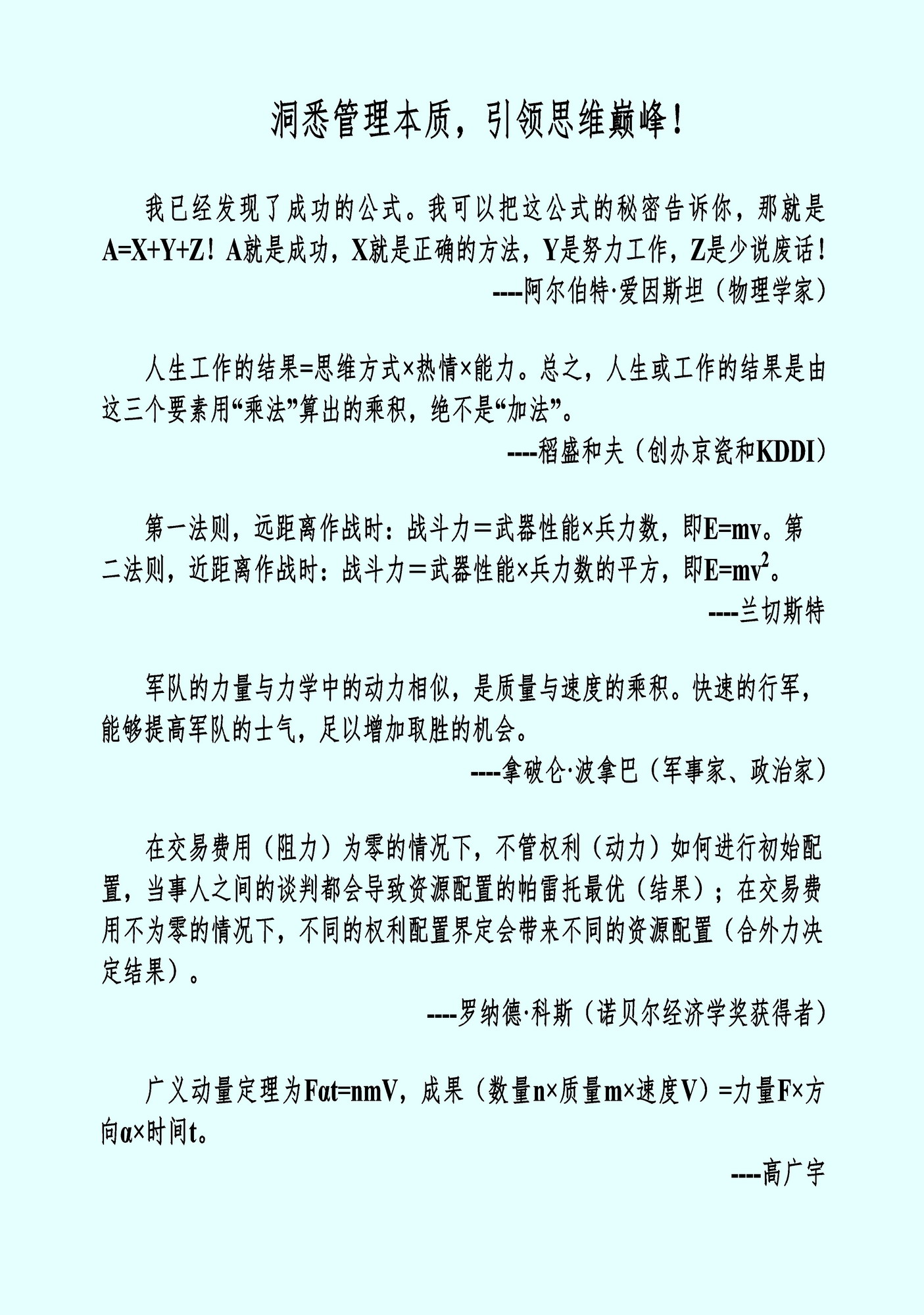 伟大的物理学家阿尔伯特•爱因斯坦说:“我已经发现了成功的公式。我可以把这公式的秘密告诉你,那就是A=X+Y+Z!A就是成功,X就是正确的方法,Y是努力工作,Z是少说废话!”通过分析,我们会发现X、Y和Z三个要素需要同时满足,才能得到成功A,所以X、Y和Z是相乘的关系,它和动量定理表达的形式也是相同的。动量定理为Ft =Δmv,右边的动量增量对应于成功A,力的方向对应于正确的方向X,力F对应于努力工作Y,时间t对应于少说废话Z。
