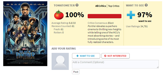 日前,漫威新片《黑豹》烂番茄口碑解禁,目前61个评论全鲜,平均打分8.6分。由于目前评分媒体的基数还不是很大,《黑豹》后续口碑走势还有待观望,但该片还是有望成为口碑最棒的超级英雄电影之一。