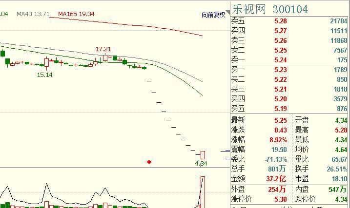 乐视网(300104)自1月24日开盘后,时至今日(2月8日)开盘经历了12个跌停板。8日早间开盘,公司股价跌停板开盘后便一路上涨,最高冲至5.28元距离涨停只差0.02元,股价波幅几近20%。截止到上午收盘,乐视网(300104)上涨6.85%,成交额达35.40亿元,系统显示资金净流入额19.52亿元,大量抄底资金入场。