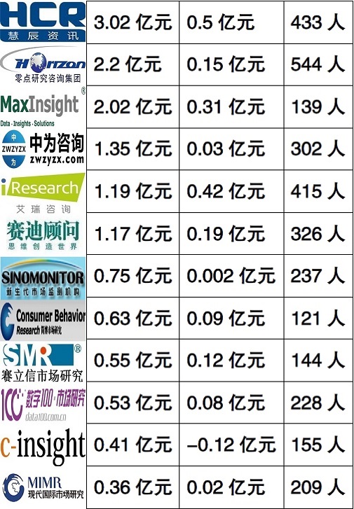 中国十二大调查研究咨询公司营收利润人数排名对比: