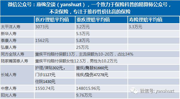 不管是哪一家保险公司,重疾获赔均值都远远低于重疾的平均治疗所需费用。除了弘康为25万外,其余各家都在20万以内,甚至很多都是10万以内。这样的一个保险金额别说覆盖弥被保人未来的收入损失了,患病期间的治疗费用都无法覆盖。