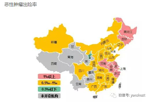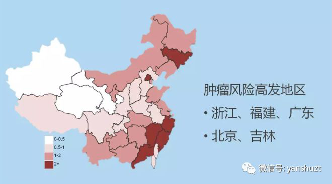 太平洋人寿理赔报告中,发布了如下图肿瘤风险指数,东北和东部地区的肿瘤风险指数高于中西部地区。