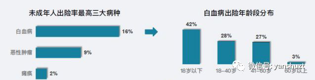 18岁以下未成年出险率最高重疾为白血病,占比为16%。太平人寿数据显示,所有重疾病种白血病是唯一一类未成年发病率超过成年人重疾的,占比达到42%。