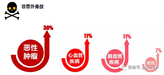 合众人寿披露了身故的原因分布,25%为意外身故,75%为非意外身故。意外身故案件中,车祸是导致死亡最主要的原因。其次分别为溺水身故、摔伤后身故、高空坠落身故。非意外身故案件中,恶性肿瘤仍是致死最多的疾病。心脑血管类疾病由于发病快,因此致死率也较高。值得注意的是:近些年,猝死呈明显增加的趋势(如下图所示)。