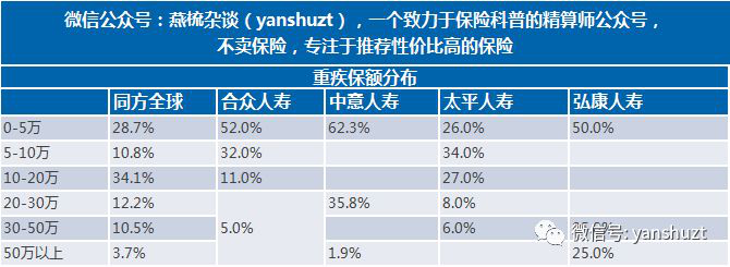 从实际保额分布来看,各家的保额主要集中在20万以内的保额,甚至很多公司5万以内的保额占比还很高。或许是认知不足,也或许是经济原因,重疾的投保保额严重不足。30万元一般可以覆盖重疾平均治疗费用,50万元则可以让客户更好的选择救治环境和获得收入补偿。因此,在预算条件允许的情况下,重疾险至少配置30-50万元。更多关于如何购买重疾保险的信息,请参考《如何优雅的购买重疾险》。