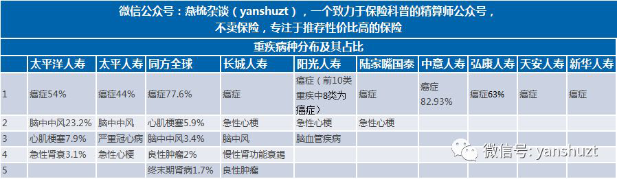 ·重疾高发的前几种疾病都是保监会强制规定的前6种中,所以购买重疾产品时,病种的数量多寡不是决定重疾产品好坏的重要因素,但是价格相当就选择病种多的产品。