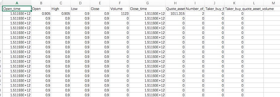 本帖提供币安平台在2017年11月到12月的各个山寨币1分钟高频交易数据。此数据格式如下: