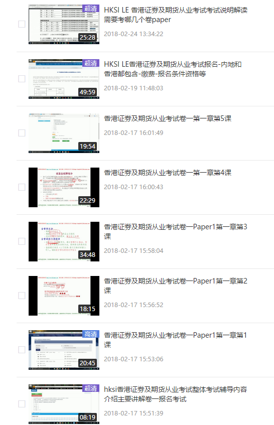 本人录制了香港证券及期货从业资格考试试卷一(HKSI LE Paper 1)的全套视屏,现在放在土豆网第一章的视屏,和关于考试的全面解析,不是打广告,有兴趣的可以看看。本人现在香港工作,针对大陆考生很多的疑惑,例如从事什么工作,该考什么卷,如何报名,到香港还是在大陆报名好,都有详细的视频解析。主要是目前市面上全面的讲解太少,youtube上的太老,很多都是错误的讲解,因此自己决定开发了一整套视屏,