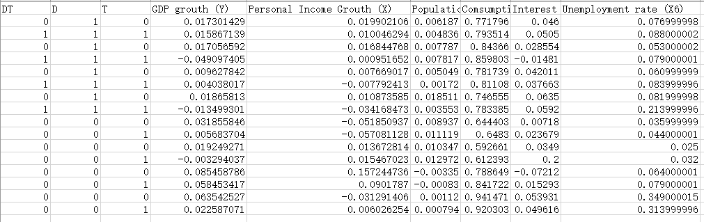 数据如上,D=1代表欧盟国,T=1代表在欧债危机期间,DT为D*T,主要分析DT=1对Y的影响,请问需要怎么设置代码呢