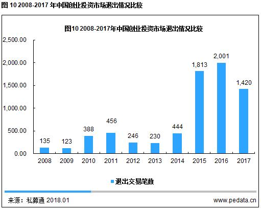 大中华区著名创业投资与私募股权研究机构清科研究中心近日发布数据显示:2017年中国创业投资市场投资十分活跃,投资金额和投资案数再创历史新高。根据清科研究中心旗下私募通统计,募资方面,2017年中外创投机构共新募集895支可投资于中国大陆的基金,披露募集金额的848支基金新增可投资于中国大陆的资本量为3,476.69亿元,平均募集规模为4.10亿元人民币;投资方面,2017年中国创业投资市场共发生4,822起投资案例,同比增长30.9%,其中披露金额的4,437起投资交易共计涉及金额2,025.88亿元人民币,投资金额同比增长54.3%,平均投资规模达4,565.89万元人民币;退出方面,2017年共发生1,420笔VC退出交易,其中IPO是最主要的退出方式,期间共计发生470笔,占比33.1%;股权转让和新三板退出分别排名第二和第三,分别发生360笔和315笔。