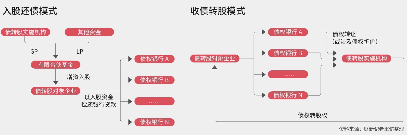 不同于传统债转股“收债转股”的操作模式,本轮债转股的主流模式是“入股还债”,即债转股实施机构先以股权投资的形式给高负债企业增资扩股,企业再以该笔注资偿还银行贷款。