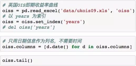 我们首先导入ois期限结构数据(来源:http://www.bankofengland.co.uk )进行无风险折现。并且同时调整数据结构。