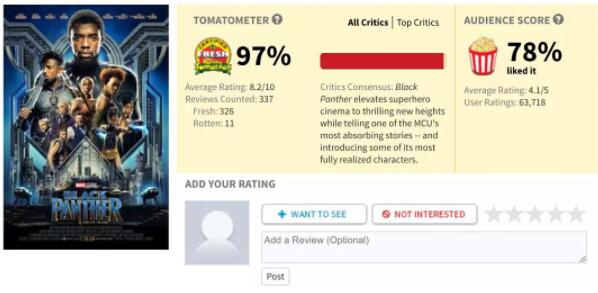 这些记录都是冰山一角,不多陈述,重要的是《黑豹》评分刚解禁,烂番茄的番茄指数就打出了100%,这是首次超级英雄电影拿到100%最好分数,虽然现在没能保持100%,但也在97%新鲜度上。