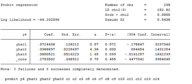 probit y1 c1 c2 c3 c5 c6 c7 c8 c9 c10 c11 c12 c13 c14 a1 a2 a3